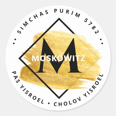 Cholov Yisroel? Pas Yisroel? Fleishig Oven? Our Simchas Purim Purple Personalized Monogram Gold Paint Swash Sticker is a classy polished way to label your Homemade Mishloach Manos with all the Kashrus info you want to share with the recipients + it's a great way to share your Purim Wishes with friends & Family. Dress up Mishloach Manos baskets & table settings. Create your own monogram and make this unique design your own when you personalize it with a Name & Initial and your personal message. Inquiries: message us or email [--]) myBestGift